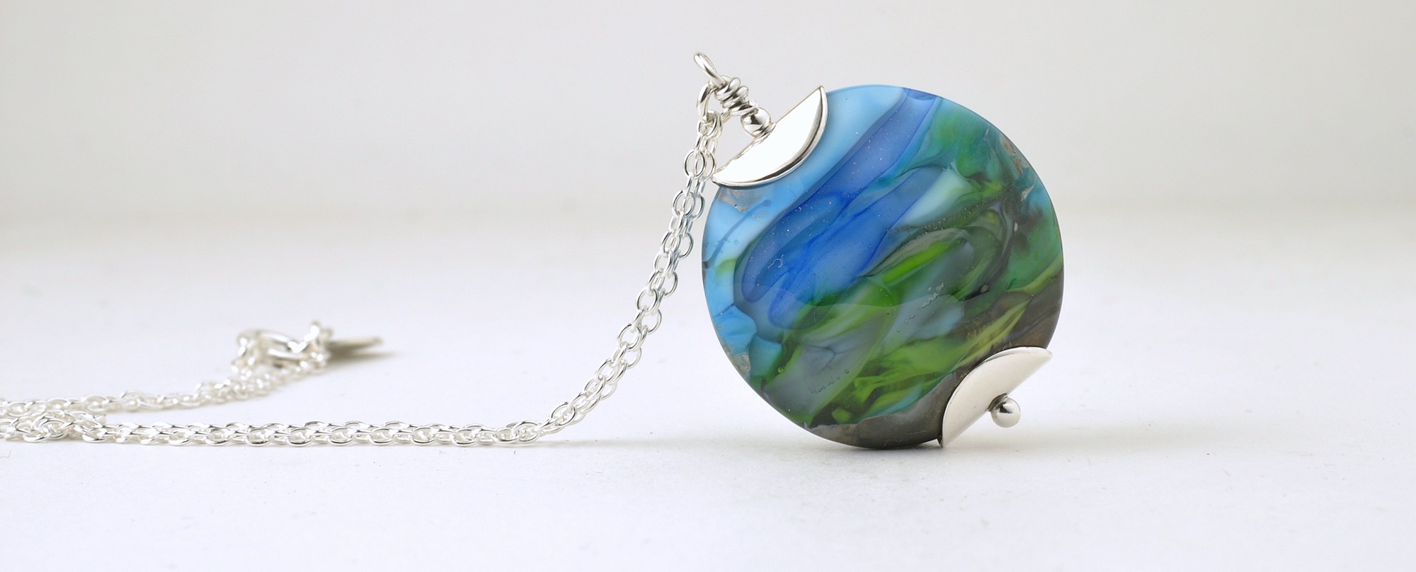 A unique collection of individually handcrafted contemporary lampwork glass necklaces and pendants. Many are one of a kind, and available on a choice of chain lengths for the perfect fit. Browse unique land and seascapes captured in glass and clear globes packed with tiny glass flowers, or choose simple, tumbled glass drops for every day wear.